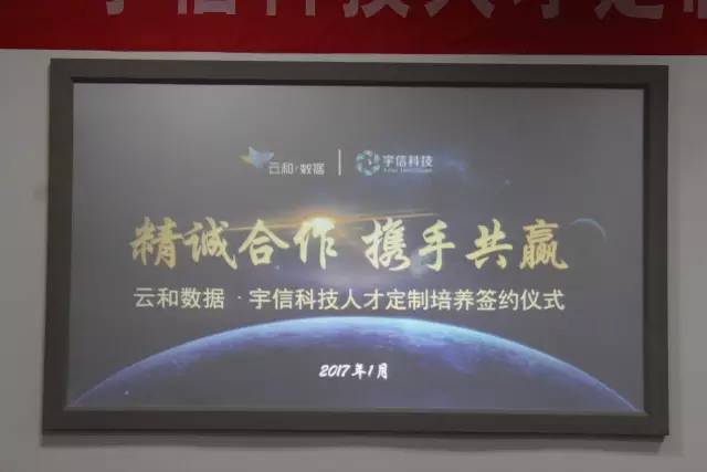 2017年1月16日上午,云和数据旗下高端泛IT教育品牌——云和教育与北京宇信科技集团股份有限公司(以下简称宇信科技)成功签订了“人才定制培养”合作协议。宇信科技郑州基地总负责人夏玉刚和云和数据王总共同出席了此次签约仪式。